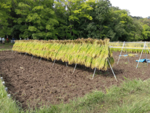この日は「キヌヒカリ」の稲刈り。手慣れた手つきであっという間に稲架かけまで終了です。