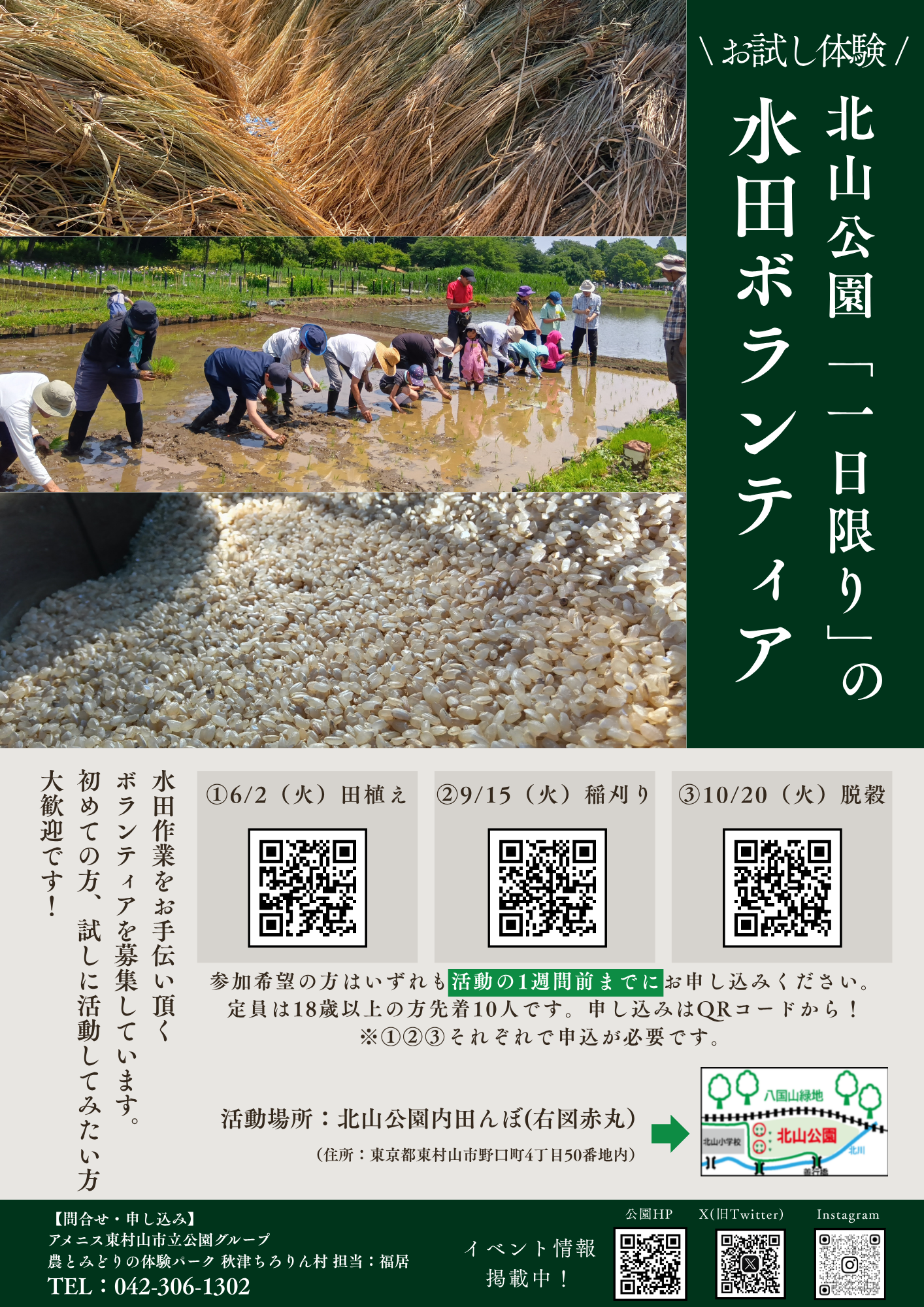 【北山公園】北山公園水田1日ボランティア募集(田植え・稲刈り・脱穀)